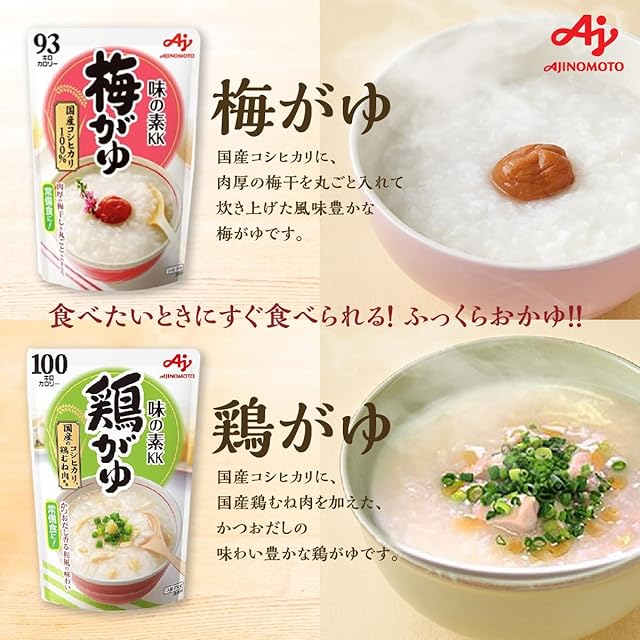 「味の素KKおかゆ」シリーズは、持ち運びに便利なレトルトパウチ。温めずにそのままでもお召し上がりいただけますので、場所や状況を問わずにお召し上がりいただくことができます。 白がゆ:国産コシヒカリと南アルプスを源とする清水を使用し、土鍋炊きに学んだ製法でふっくらと炊き上げた白がゆです。 梅がゆ:国産コシヒカリに、肉厚の梅干を丸ごと入れて炊き上げた風味豊かな梅がゆです。 玉子がゆ:国産コシヒカリに、こだわりのふんわり玉子をたっぷり加え、和風だしで炊き上げた玉子がゆです。
