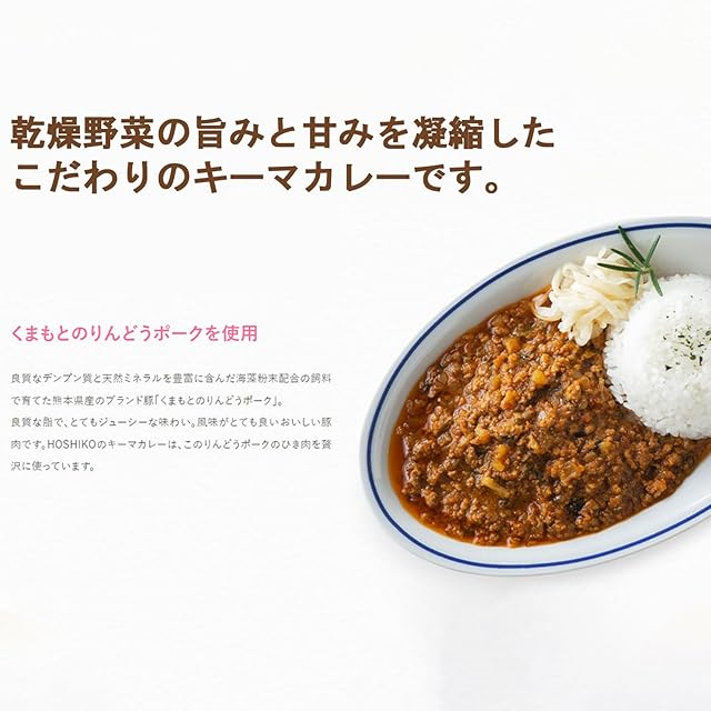 【熊本県産 はちべえトマトのキーマカレー】<br /> 見た目が不揃いで出荷できないトマトに、新しい価値をふきこむトマトロジープロジェクト。<br /> 熊本県八代産の「はちべえトマト」を使用。<br> 野菜本来の甘味と旨みが凝縮した8種の乾燥野菜と熊本のブランド豚「りんどうポーク」をたっぷり使ったキーマカレー。<br> 小麦粉を使用せず、れんこんのすりおろしを加え、とろみをつけました。<br> ※この製品はレトルトパウチ食品ですので保存料は使用しておりません。<br /> <br /> 【内容量】 <br /> 4袋(4人前)(180g×4袋) <br /> 【原材料】 <br /> 豚肉(熊本県産)、野菜(玉ねぎ、れんこん)、乾燥野菜(トマト、人参、玉ねぎ、セロリ、にんにく、キャベツ、小松菜、白菜、生姜)、植物油脂、トマトケチャップ、ウスターソース、チャツネ、カレー粉、香辛料、食塩、(一部に豚肉・りんご・大豆・バナナを含む) <br /> 【賞味期限】 <br /> 枠外下部に記載 <br /> 【保存方法】 <br /> 直射日光・高温多湿を避けて、常温で保存してください。<br /> <br /> ■お召し上がり方 <br />【お湯で温める場合】 <br /> 袋のまま沸騰したお湯に入れて、5分間加熱してください。 <br /> 【レンジで温める場合】 <br /> 袋を開封し、中身を深めの皿に移し替え、ラップをかけて500wで約2分間加熱してください。 <br /> 【栄養成分表示】1袋(180g)当たり <br />エネルギー:230Kcal / たんぱく質:12.2g / 脂質:14.9g / 炭水化物:11.5g / 食塩相当量:1.51g