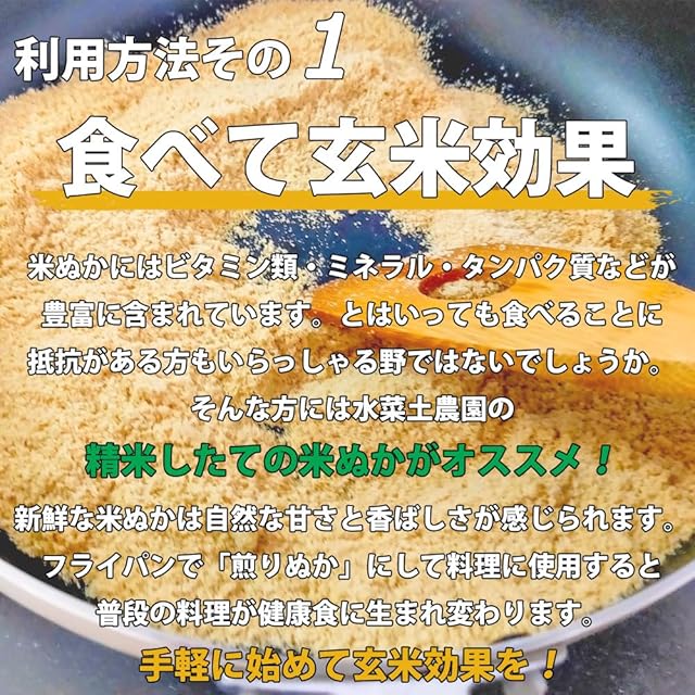 3 ご利用方法は、お漬物の「ぬか床」は勿論ですが、フライパンで「煎りぬか」にして料理に使用すると普段の料理が健康食に生まれ変わります。是非お試しください。