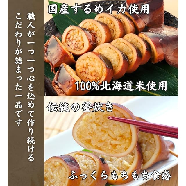 函館名産お袋の味「いかめし」いかをふっくらボイルし、うるち米ともち米のブレンドを詰め、いかに最も合う醤油ベースの甘だれで味付けしております。真空包装し、加熱殺菌しておりますので未開封なら常温保存が可能で、調理もボイルするだけですので、簡単便利に召し上がれます。