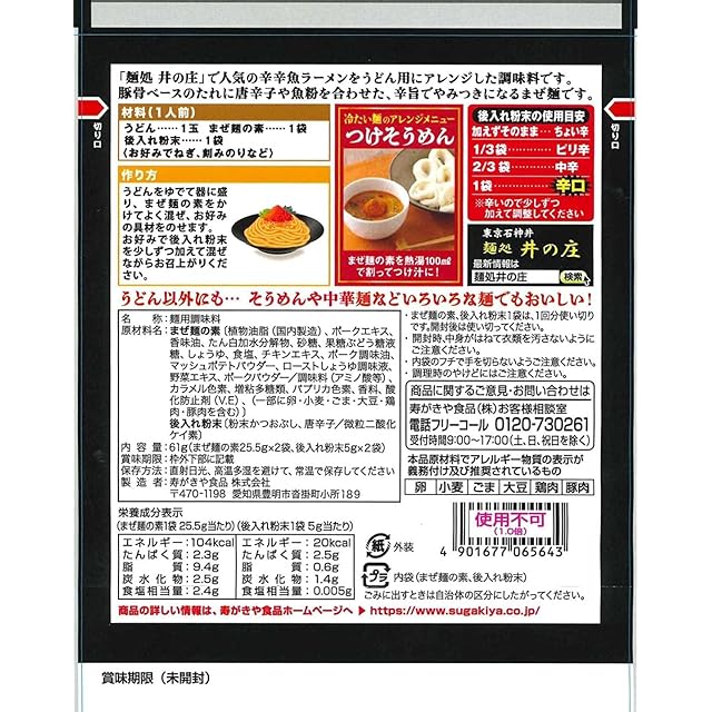【説明】東京石神井にある人気店『麺処 井の庄』監修のまぜ麺の素です。茹でたうどんに液体スープ、別添の辛魚粉を絡めるだけの簡単調理です。温かい麺にも、冷たい麺にも合うように仕上げました。しょうゆ豚骨味に、赤唐辛子と魚粉を合わせた辛魚粉がクセになる味わいです 【名称】:麵用調味料 【材料名】:まぜ麺の素(植物油脂(国内製造)、ポークエキス、香味油、たん白加水分解物、砂糖、果糖ぶどう糖液糖、しょうゆ、食塩、チキンエキス、ポーク調味油、マッシュポテトパウダー、ローストしょうゆ調味液、 野菜エキス、ポークパウダー/調味料(アミノ酸等)カラメル色素、增粘多糖類、パプリカ色素、香料、 化防止剤(V.E)、(一部に卵・小麦・ごま・大豆・鶏肉・豚肉を含む)〕後入れ粉末(粉末かつおぶし、唐辛子/微粒二酸化ケイ素〕
