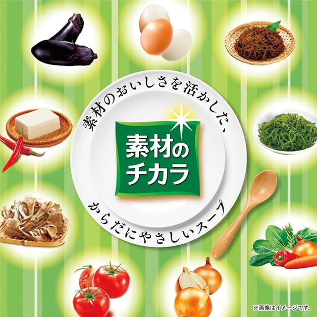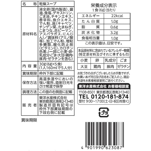 原材料:鶏卵、食塩、醤油、チキンエキス、デキストリン、ごま油、魚介エキス、香辛料、具(キャベツ、たまねぎ、こまつな、赤ピーマン、にんじん、アスパラガス)/調味料(アミノ酸等)、加工でん粉、増粘多糖類、酸化防止剤(ビタミンE)、カロチン色素、(一部に小麦・卵・乳成分・ごま・大豆・鶏肉を含む)