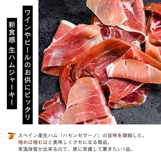 スペイン産の生ハムを乾燥させて作ったジャーキーです。生ハム特有のコクや塩味、香りはそのまま。 ワインやお酒のおつまみには勿論のこと、おやつ感覚でそのままポリポリいただけます。 また、サラダや前菜、リゾットやパスタにかければ食感も楽しめます。常温で保管ができますので、持ち歩きにも便利です。変わり種のちょっとした手土産にも喜ばれます。
