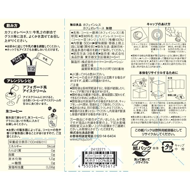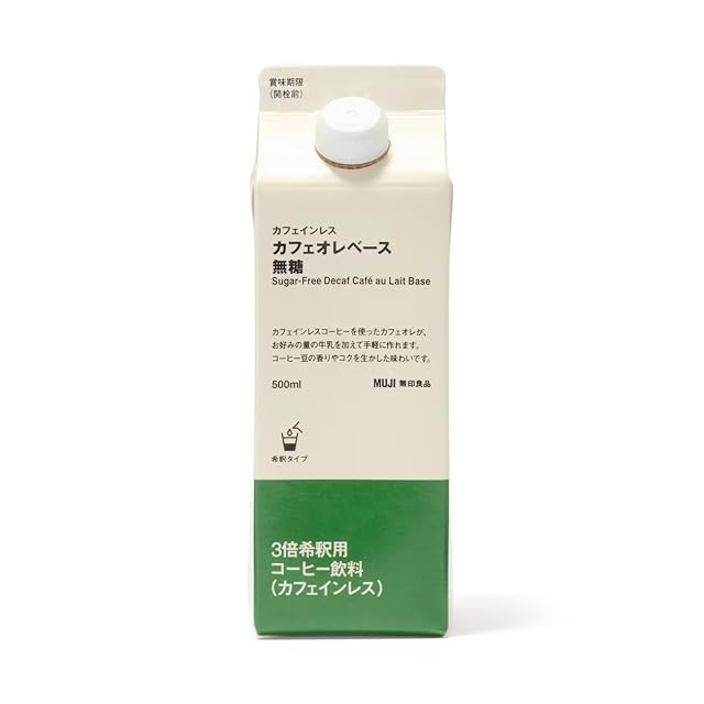【無印】 カフェインレスコーヒーを使ったカフェオレが、お好みの量の牛乳を加えて手軽に作れます。コーヒーの豆の香りやコクを生かした味わいです。
