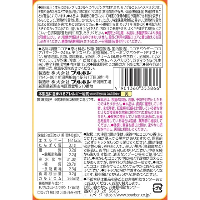 原材料:砂糖(韓国製造、国内製造)、ココアパウダー(ココアバター22~24%)、デキストリン、脱脂粉乳、クリーミングパウダー(デキストリン、植物油脂、乳糖、脱脂粉乳、全粉乳、クリーム(乳成分を含む))、全粉乳、カカオマス、しょうが粉末、食塩/炭酸カルシウム、ヘスペリジン、カゼインNa(乳由来)、香辛料抽出物