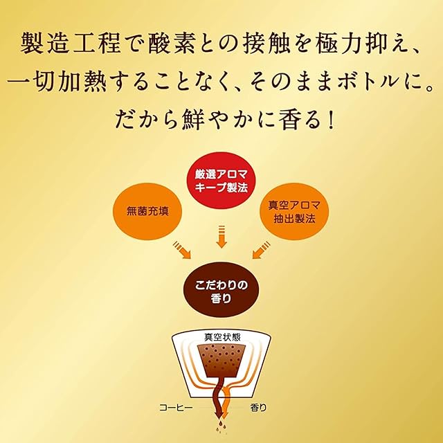 挽きたての香り、澄んだコク、すっきりした後味を楽しめます。厳鮮アロマキープ製法で、香りを多く含む成分をより厳しい基準で管理して、酸化の原因となる空気との接触を従来品よりもさらに低減することで、上質な香りを素早く封じ込めています。新しいゴールドブレンドの挽きたての香りと味わいは、ひとくちずつ味わいたくなるアイスコーヒーです。 持ちやすく、注ぎやすいボトル形状です。独自の製法でカフェイン97%カット。ボトルコーヒー。