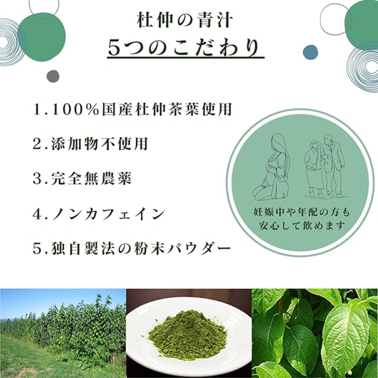 杜仲に含まれる成分:ゲニポシド酸、アスペルロシド、タンニン、クロロゲン酸、食物繊維、クロロフィル、亜鉛、ミネラルなど