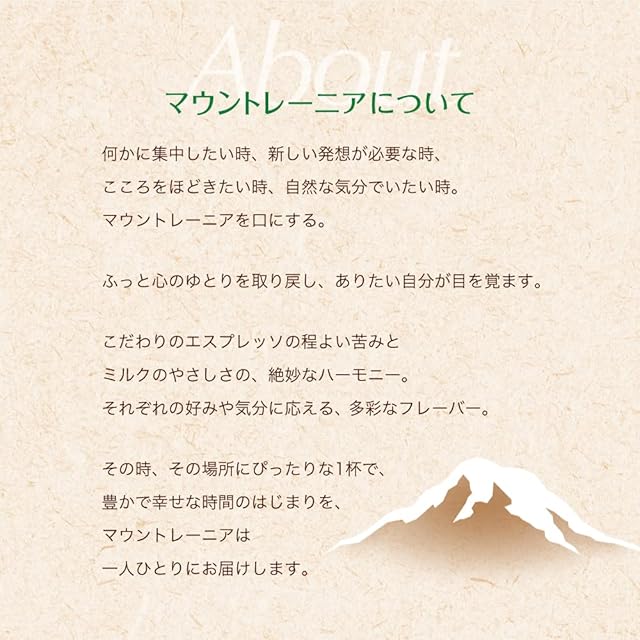 【マウントレーニア】こだわりのエスプレッソの程よい苦みとミルクのやさしさの、絶妙なハーモニー。それぞれの好みや気分に応える、多彩なフレーバー。