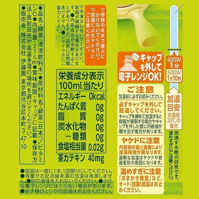 栄養成分(100ml当たり):エネルギー:0kcal、たんぱく質:0g、脂質:0g、炭水化物:0g(糖類:0g)、食塩相当量:0.02g、茶カテキン:40mg