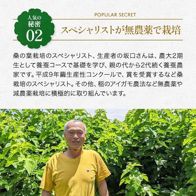 桑茶の生産者は、2代続く養蚕のプロ、坂口さん。稲作などもアイガモ農法など無農薬、減農薬に積極的に取り組んでいます。在庫の関係上、生産者が坂口さんから別の有機認証農家さんに変更または両者の配合になる場合があります。いずれも熊本産、農薬不使用です。