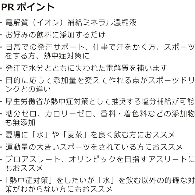 【使用目的】電解質の補給。お好みの飲料に加えるだけで、「日常生活レベル」「スポーツ時」「日常生活での熱中症対策」「暑熱環境での長時間の仕事・スポーツ時」などの目的に応じて濃度を変えた電解質(イオン)含有の飲料水をお飲み頂けます。