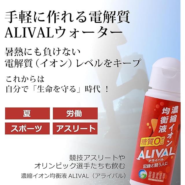 ALIVAL(アライバル)はプロアスリートも飲む、脱水・熱中症対策の電解質イオン濃縮液。飲料水に加えて水分とともに電解質補給。発汗・熱中症対策、マラソン、アスリート、スポーツ愛好家、外勤の方、登山者などにおススメ。厚生労働省が熱中症対策として推奨する塩分補給が可能。汗とともに失われる電解質を補うのがALIVALを添加した「ALIVALウォーター」。ALIVALウォーターは一般的なスポーツドリンクのような塩分補給商品とは異なり、糖分・カロリー・添加物ゼロ。濃縮タイプなので加える量を変えることで飲料を「熱中症対策ドリンク」に。アスリートやオリンピック選手も飲むALIVALアライバルをおススメ。日常生活において、「起床後」「入浴後」「飲み会の後」等に飲むにもおススメ。★ALIVALウォーターの作り方チラシを同梱させて頂いております。