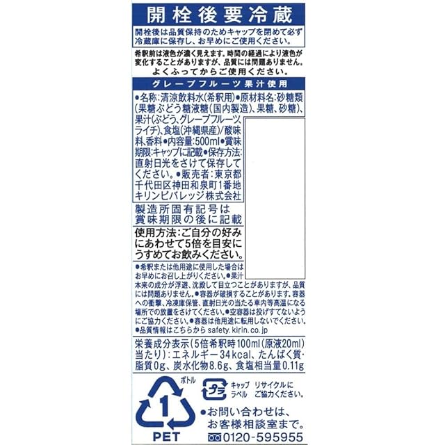 [栄養成分(5倍希釈時100ml(原液20ml)あたり)]エネルギー34kcal、たんぱく質0g、脂質0g、炭水化物8.6g、食塩相当量0.11g