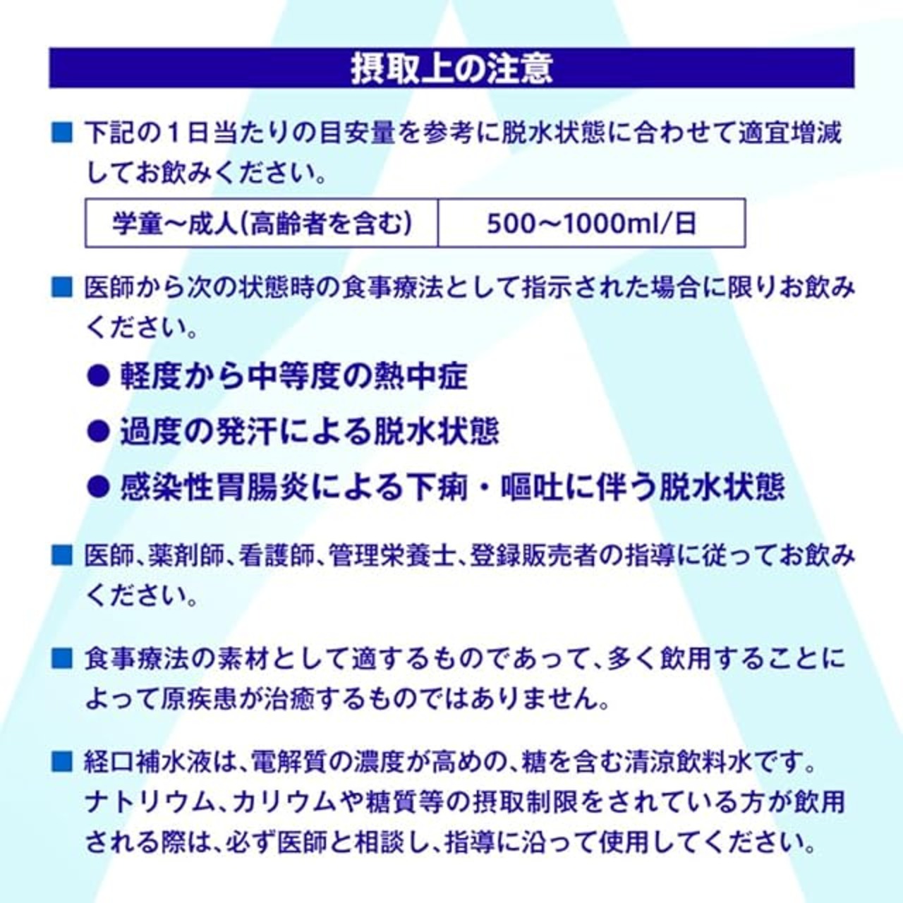 【栄養成分表示】 エネルギー:11kcal たんぱく質:0g 脂質:0g 炭水化物:2.7g 食塩相当量:0.249g カリウム:80mg ブドウ糖:1.5g 塩素:169.4mg 【関与する成分の濃度】Na:43mEq/L、K:21mEq/L、Cl:48mEq/L、ブドウ糖:1.5%、モル濃度比(ナトリウム:ブドウ糖)1:2、浸透圧:263mOsm/kg