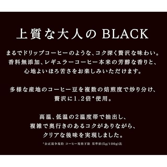 上質な大人のBLACK。<br> ドリップコーヒーのような、贅沢でコク深い味わいが特長の無糖コーヒーです。<br> ・レギュラーコーヒー100%<br> 香料無添加。<br> ・コーヒー豆1.2倍(*)使用<br> *公正競争規約 コーヒー規格下限 基準値(5g/100g)比<br> 長時間焙煎と短時間焙煎のコーヒー豆を贅沢に使用。<br> コクと華やかな香りを実現。<br> ・2温度帯抽出(高温・低温)<br> 2温度帯で抽出することでコクがありながら後キレの良い味わいに。<br>