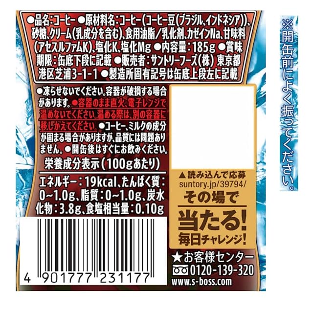 原材料:コーヒー(コーヒー豆(ブラジル、グアテマラ、その他))、砂糖、牛乳、クリーム、食用油脂/乳化剤、カゼインNa、甘味料(アセスルファムK)