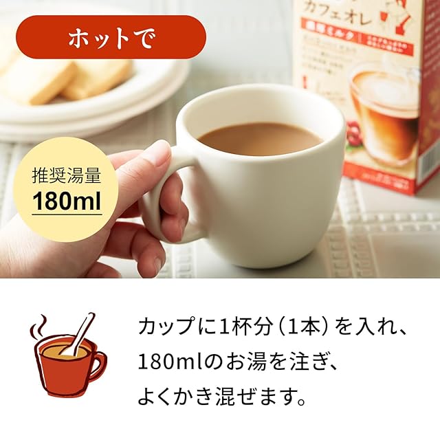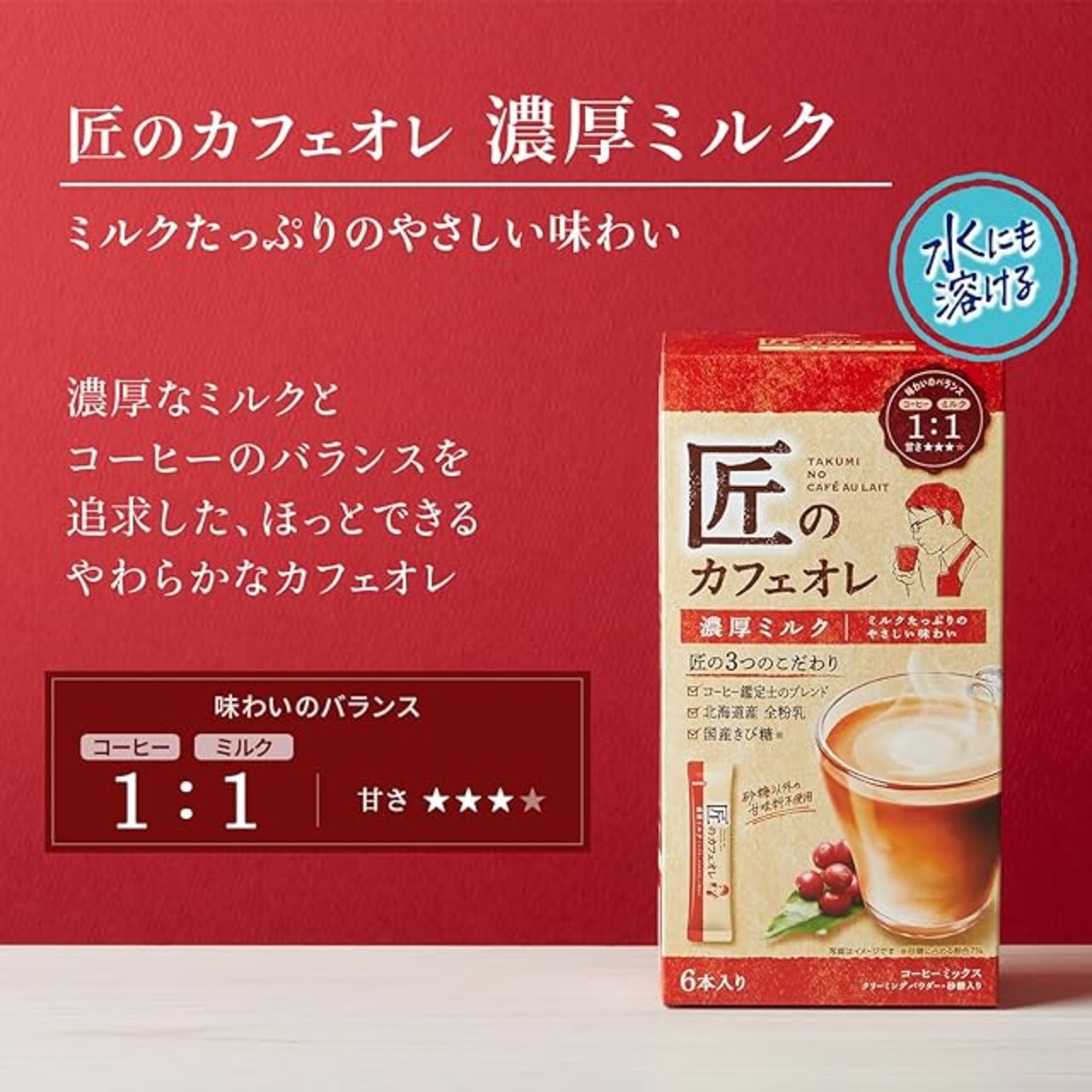濃厚なミルクとコーヒーのバランスを追求した、ほっとできるやわらかなスティックタイプのカフェオレ。「コーヒー」「ミルク」「砂糖」。匠がこの3つにこだわって作り上げた、やさしい味わい。