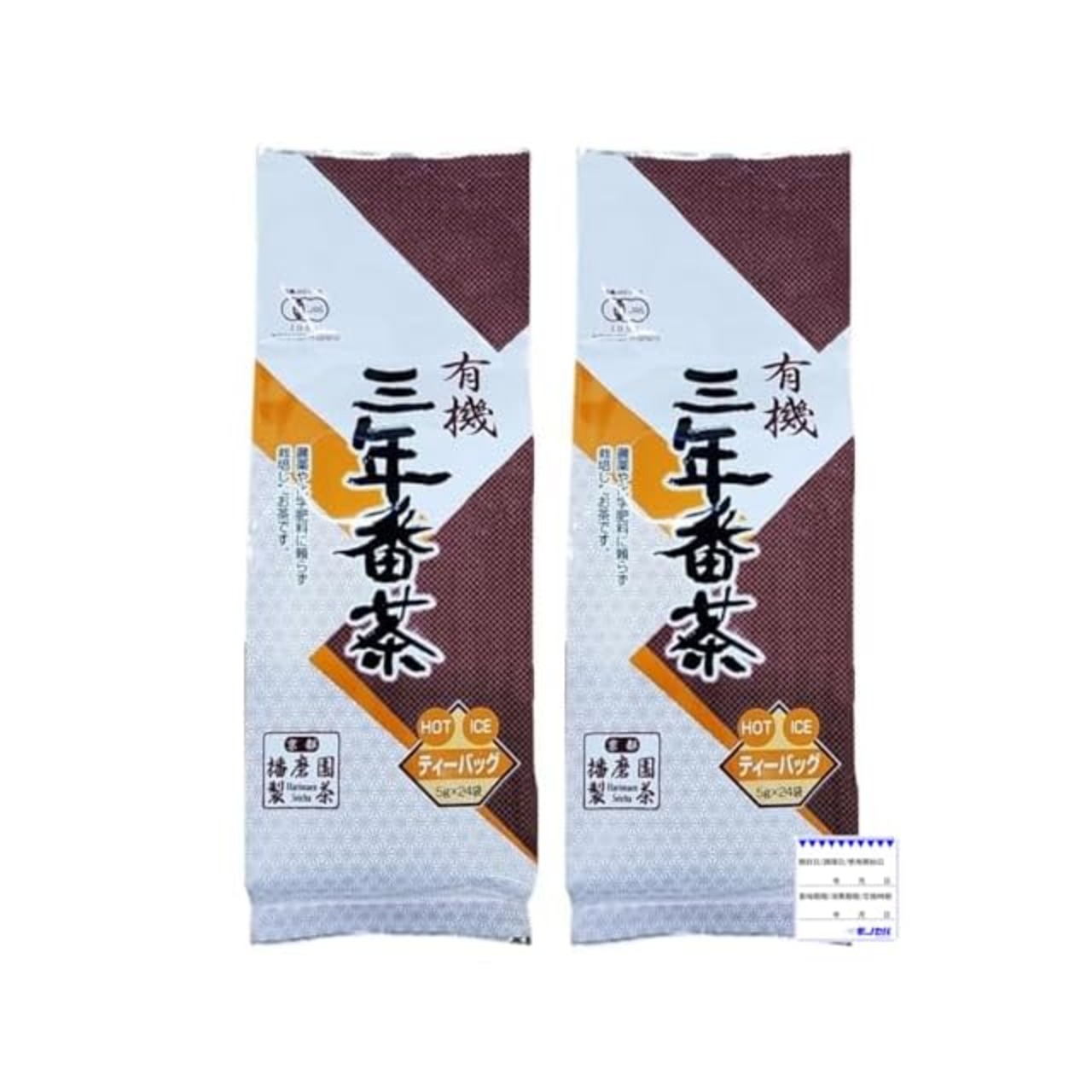 有機三年番茶は宇治茶の主産地、京都宇治田原の霧深い山間の茶畑で有機栽培された茶葉と、茎(奈良県、宮崎県、大分県産)を程よく熟成させ、丹念に焙煎しオリジナルブレンドにて製造いたしました、香ばしくまろやかで豊かな味わいのお茶でございます。<br>本品は熟成保存によりカフェイン等の刺激物が少なくなり、ご年配の方からお子様まで、時間を問わずいつでもご家族皆様でお飲み頂けます。<br>煮出しても急須でも美味しくつくれ、夏の暑い日はアイスでごくごく水分補給に、寒い冬などにはホットでほっこり、梅干や醤油などを入れて体ポカポカ、梅醤番茶などでお楽しみ下さい。<br>内容量:24P×2箱/商品管理シール×2枚