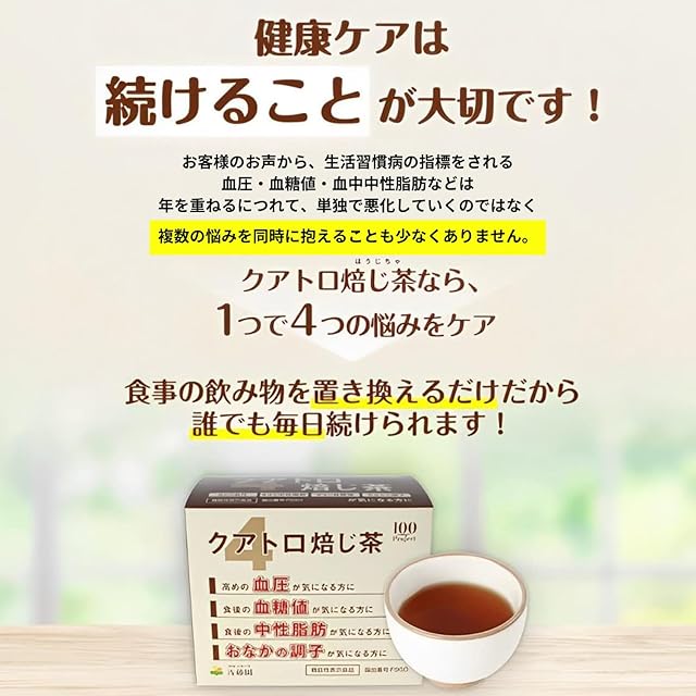 【機能性表示食品 クアトロ焙じ茶】 史上初!4つの機能を備えた美味しい焙じ茶! 普段から健康を気にされている(食後の血糖値やお腹まわりが気になる方、おなかの調子が気になる方、高めの血圧が気になる方)多くの方にお勧めです。 難消化性デキストリン(食物繊維として)が含まれており、難消化性デキストリン(食物繊維として)には、 食後血糖値の上昇を抑制する機能・食後血中中性脂肪値の上昇を抑制する機能・おなかの調子を整える機能があることが報告されています。 また本品にはGABAが含まれています。GABAには血圧が高めの方に適した機能があることが報告されています。
