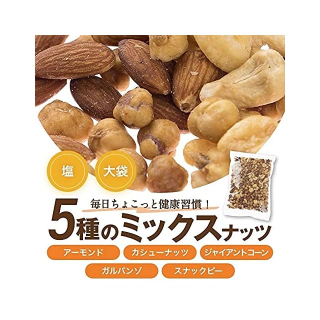 おつまみにおやつにいろんな種類のナッツをどうぞアーモンド、カシューナッツ、ガルバンソ(ひよこ豆)、スナックピー(醤油味)、ジャイアントコーンのミックスです。 落花生、小麦粉、カシューナッツを使用しています。同じ設備でクルミ、大豆を取り扱っています。
