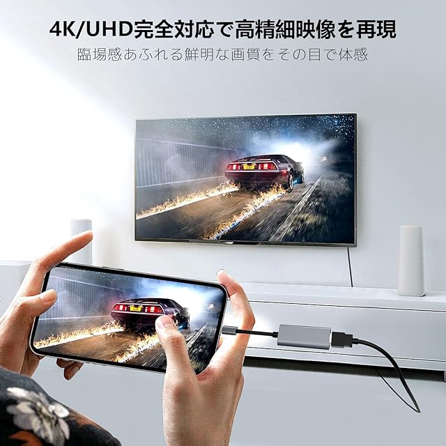 「大人気のスマホからテレビ変換アダプタ」:USB-C/Thunderbolt搭載デバイスからHDMIテレビ・プロジェクターへワンタップ接続。YouTube動画・オンライン会議・ゲームプレイを4K解像度で投影可能。複数デバイスの画面同期表示にも対応(※Xperia/Google Pixel等一部機種除く)。