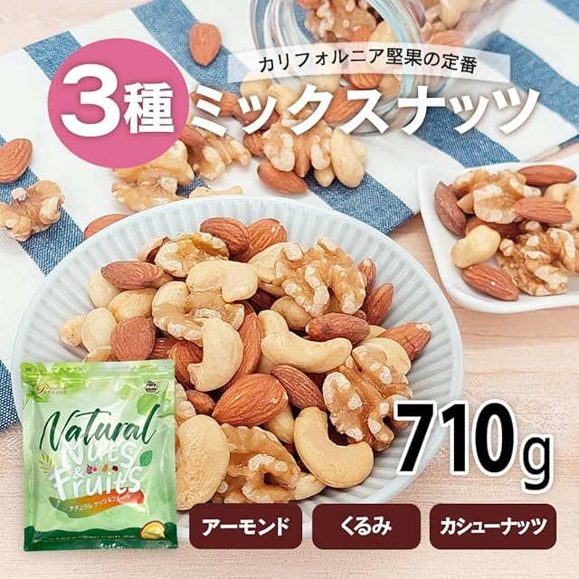 ● 名称:木の実 ● 内 容 量:710g ※商品の特性上、重量に±1~5%ほどの誤差が生じてしまう場合がございます。あらかじめご了承ください。) ● 原材料名:アーモンド(アメリカ産)、カシューナッツ(ベトナム産)、くるみ(中国産) (アーモンドとカシューナッツを焙煎。くるみは生。)● 栄養成分表示: (100g 当たり) エネルギー 615kcal / たんぱく質 17.77g / 脂質 55.89g / 炭水化物 21g / 食塩相当量 0.01g● 賞味期限:枠外下部に記載 ● 保存方法:直射日光を避けて、常温で保存してください。