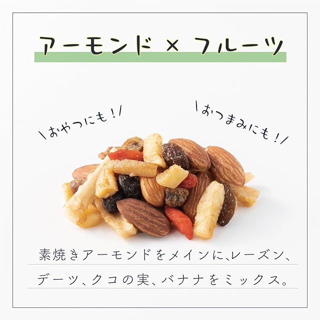 【原材料名】素焼きアーモンド(アーモンド(アメリカ))、バナナスティック(バナナ(フィリピン)、ココナッツオイル、砂糖、食塩)、レーズン(ぶどう、植物油)、ドライデーツ(デーツ、米粉)、乾燥クコの実