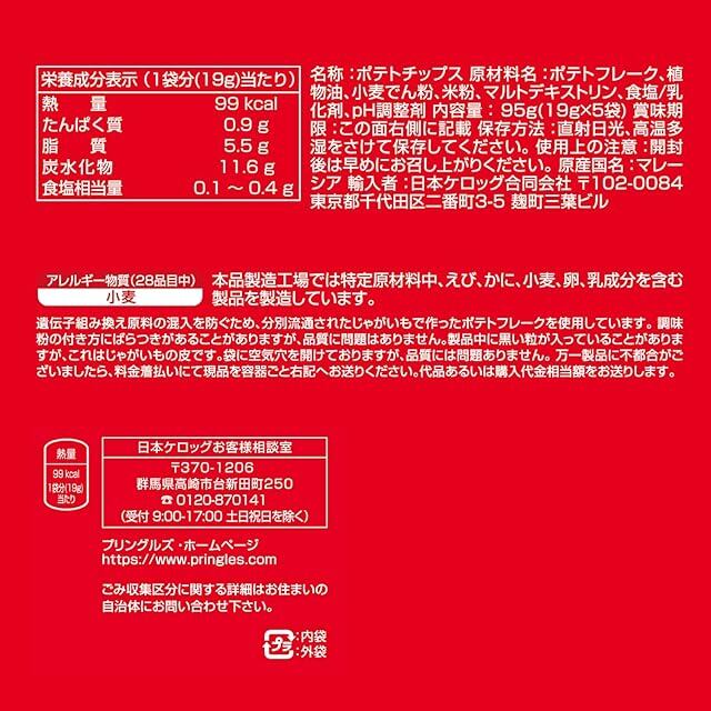 1袋分(19g)当たり:熱量・・・98kcal,たんぱく質・・・0.9g,脂質・・・5.4g,炭水化物・・・11.5g,食塩相当量・・・0.2~0.5g