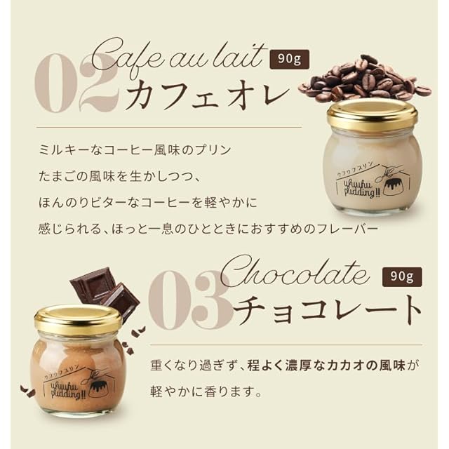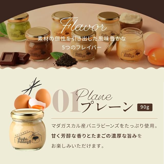 【プレーン】バニラビーンズをたっぷり使用しており、豊かな香りとたまごの濃厚な旨みが感じられます。【チョコレート】ほどよく濃厚で軽やかなカカオの風味 【抹茶】宇治抹茶を使用したクリーミーな味わいと程よい甘さとコク 【カフェオレ】ほんのりビターなコーヒーを軽やかに感じられるミルキーなコーヒー風味のプリン【アールグレイ】華やかな香りとクリーミーな優しい味わいのプリンです。