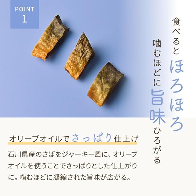 オリーブオイルでさっぱり仕上げ。石川県産のさばをジャーキー風に。オリーブオイルを使うことでさっぱりとした仕上がりに。噛むほどに凝縮された旨味がひろがります。