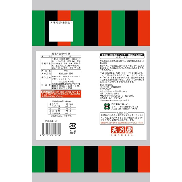 せんべい生地に一枚一枚に歌舞伎の家紋をデザインしたものを刻印し香ばしく揚げた天乃屋秘伝の甘口しょうゆタレで味付けした風味豊かな揚げせんべいです。