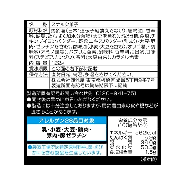 原材料:馬鈴薯(遺伝子組換えでない)、植物油、砂糖、たんぱく加水分解物、オニオンパウダー、ガーリックパウダー、食塩、ブドウ糖、香辛料、香味油、調味料(アミノ酸等)、パプリカ色素、酸味料、香料、香辛料抽出物、甘味料(ステビア、カンゾウ)、(原材料の一部に乳成分、小麦、大豆を含む)