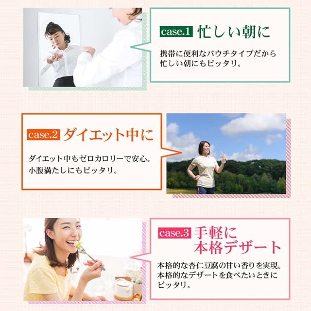 【まろやかな杏仁豆腐に白桃の甘みが重なる美味しさ、0kcalパウチゼリー】杏仁霜を使用し、本格的な杏仁豆腐の甘い香りを実現。杏仁のまろやかな甘みと共に、白桃の甘く華やかな香り・味わいを、みずみずしい食感にて楽しめます。0kcalなので、カロリーを気にする方にもぴったりのヘルシーなパウチゼリーです。食品表示基準に基づき、100g当たり熱量5kcal未満を0kcalとしています。0kcalの糖質(エリスリトール)を使用しています。