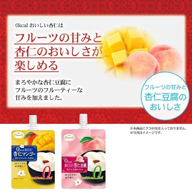 【まろやかな杏仁豆腐にマンゴーの豊かな甘みが重なる美味しさ、0kcalパウチゼリー】杏仁霜を使用し、本格的な杏仁豆腐の甘い香りを実現。杏仁のまろやかな甘みと共に、マンゴーの豊かな香り・味わいを、みずみずしい食感にて楽しめます。0kcalなので、カロリーを気にする方にもぴったりのヘルシーなパウチゼリーです。食品表示基準に基づき、100g当たり熱量5kcal未満を0kcalとしています。0kcalの糖質(エリスリトール)を使用しています。