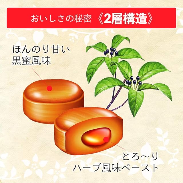 原材料:水飴(国内製造)、砂糖、還元澱粉糖化物、食用油脂、クロモジエキス末、黒蜜、ハーブエキス/甘味料(ソルビトール)、香料、乳化剤