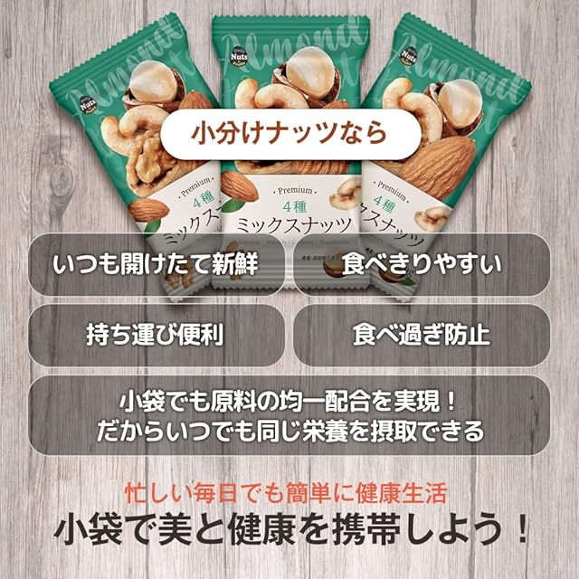 原材料名:アーモンド(アメリカ産)、くるみ、カシューナッツ、マカダミアナッツ