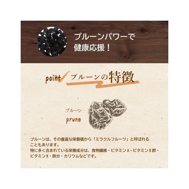 原材料名 プルーン(アメリカ) プルーンは鉄分、ビタミン、カリウムなどのミネラルもたっぷり。 (カリフォルニアプルーン協会ホームページ 参照) 適度な酸味を秘めた甘酸っぱい味わいと豊かな果肉からくる柔らかい食感が人気です。