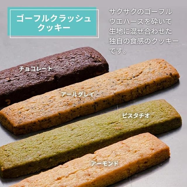 【商品名】ゴーフルクラッシュクッキー18本入り【内容量】アーモンド5本、チョコレート5本、ピスタチオ4本、アールグレイ4本