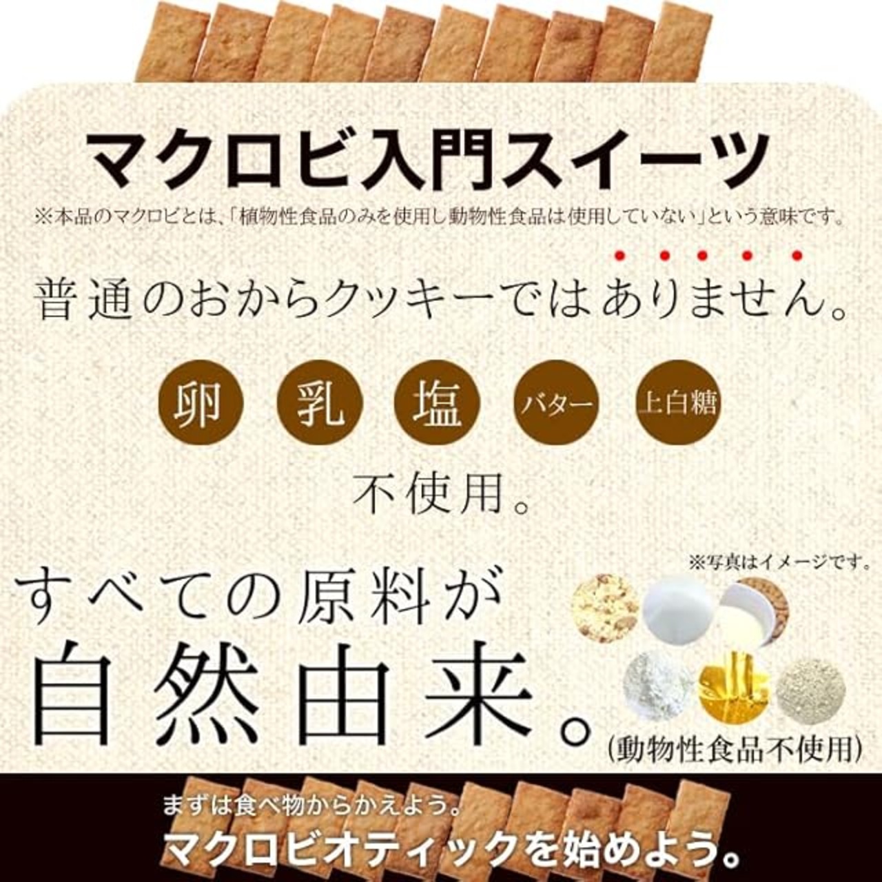 ✅【すべての原料が自然由来】卵、牛乳、食塩、バター、白砂糖一切不使用!!カラダに無理のない素材。 「厳選素材」 マクロビ仕様のこだわりヘルシークッキー。 自然由来の原材料を厳選し、おから(国産大豆使用)、小麦粉(国産)、 砂糖(ビート糖)、菜種油、豆乳、全粒粉といったカラダに無理のない原材料を使用し、多くの方にお召し上がり頂けるクッキーになりました。