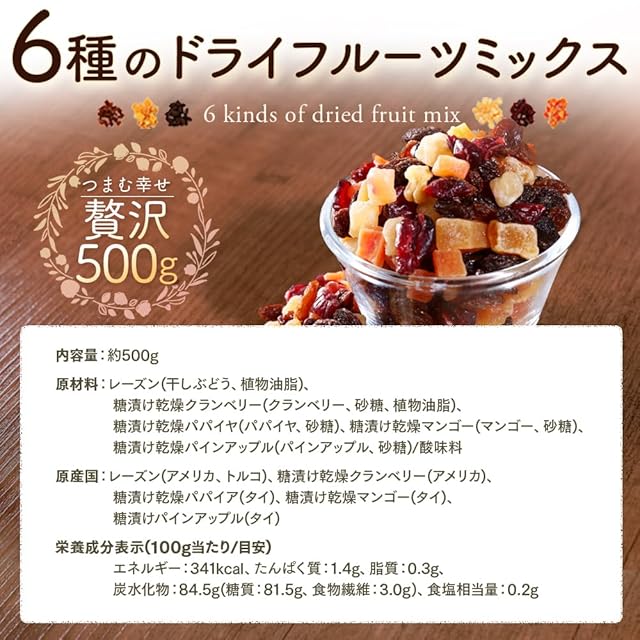 原材料:レーズン(干しぶどう、植物油脂)、糖漬け乾燥クランベリー(クランベリー、砂糖、植物油脂)、糖漬け乾燥パパイヤ(パパイヤ、砂糖)、糖漬け乾燥マンゴー(マンゴー、砂糖)、糖漬け乾燥パインアップル(パインアップル、砂糖)/酸味料