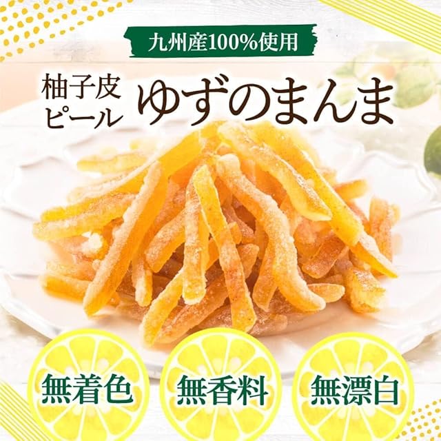 【栄養豊富な九州産ゆず皮を使用】使用しているのは、九州産のゆず皮です。温暖な気候と豊かな土壌で育ったゆずは、とっても栄養豊富!ゆず皮に含まれるビタミンCは果汁の4倍ともいわれ、捨てるにはもったいない部分なのです。また、苦みの原因でもある白い部分は丁寧に除去していますので、美味しく味わっていただけます。
