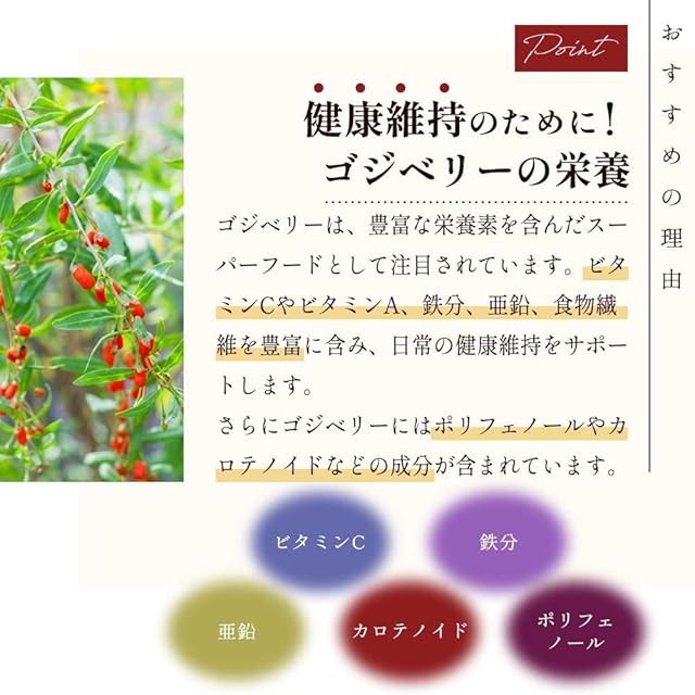 ✅【女性に嬉しい栄養素が豊富】ゴジベリーにはおよそ100種類もの栄養素が含まれていると言われていますが、なかでも注目なのがビタミンやミネラルといった女性にうれしい栄養素たち。ビタミンCやミネラル、必須アミノ酸など美容や健康の面で注目されている栄養素がゴジベリーには豊富に含まれています。