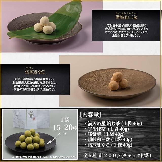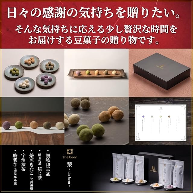 恵み茶屋 豆菓子 ギフト お中元 【-the_bean-/讃岐和三盆_焙じ茶_焙煎きなこ_宇治抹茶_綾紫芋_各40g 計200g】