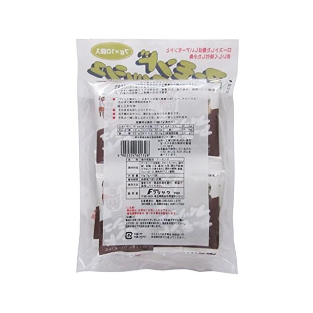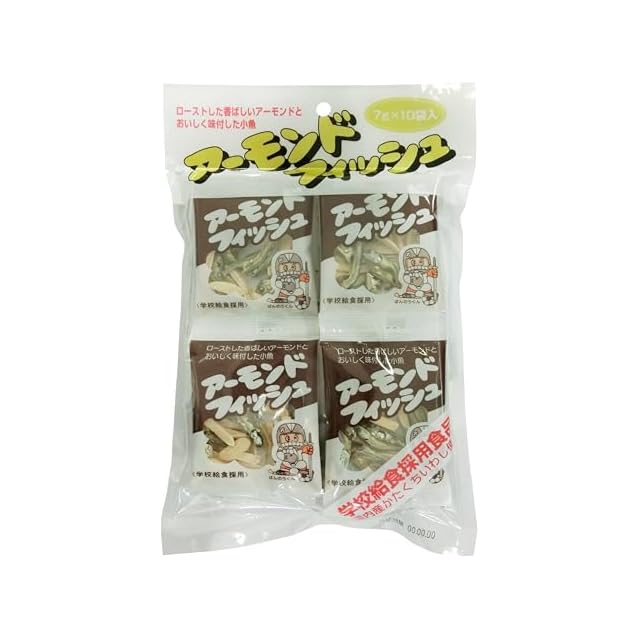 原材料:アーモンド(米国産)、かたくちいわし(国内産)、砂糖、ごま、醤油〔大豆(遺伝子組換えでない)・小麦を含む〕、澱粉分解物、食塩、トレハロース、調味料(アミノ酸等)