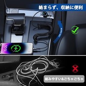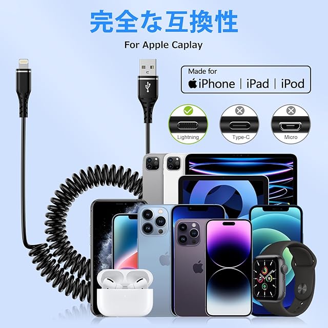【CarPlay対応&急速充電】USB コイル ライトニングケーブルはApple CarPlayをサポートしています。車のエンターテインメントシステムに安全で安定した接続を提供し、外出先でもお気に入りの音楽、ナビゲーションやポッドキャストなどを楽しむことができます。このコイル状のiPhoneコードは、3.0Aと480Mbpsの高速での同時充電とデータ転送をサポートします。充電ライフをより便利に、より安全にします。