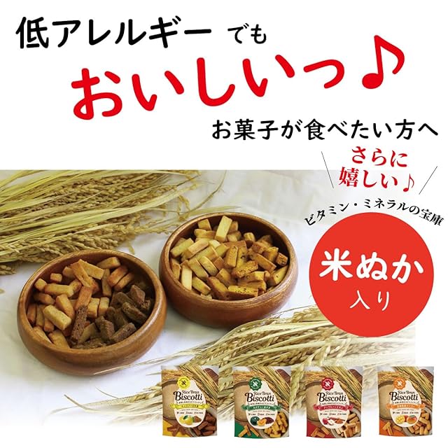 ライスブランビスコッティ の紹介 九州は宮崎県高千穂町の廃校となった給食室を使って製造しています。 有機無農薬栽培で育てた米粉(ヒノヒカリ、ミズホノチカラ)と米ぬか、キビ砂糖に野菜や果物を生地に混ぜ込んで焼き上げたグルテンフリーの無添加お菓子ビスコッティです。 オーガニックの焼き菓子なので、ビーガンの方でも気にせずに召し上がっていただけるしっかり噛むヴィーガンスイーツです。 ビスコッティという響きにはあまり馴染みがないかもしれませんが、クッキーやサブレ、ビスケット、ラスク、スコーン、せんべい、米粉クッキー、オーガニックお菓子等と同じスイーツ・焼き菓子の仲間です。 こちらの商品の一番の特徴は焼き菓子にはかかせない卵や牛乳などのアレルギーのある食材をほとんど使用しておりません。いわゆる7品目不使用となっております(アレルギー対応)。動物成分不使用の硬めのおやつです。 中身は4種類が食べ比べできる自然派堅焼きのお試しセットです。 動物成分不使用で硬めのおやつです。