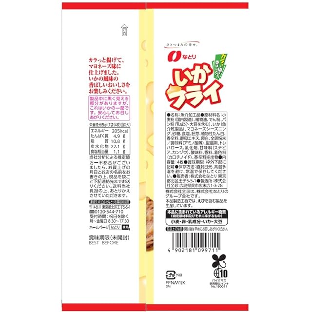 原材料:小麦粉(国内製造)、植物油、でん粉、パン粉(乳成分・大豆を含む)、いか(魚介乾製品)、マヨネーズシーズニング、砂糖、食塩、胚芽、植物性たん白、香辛料、酵母エキス、卵白、全卵粉末/調味料(アミノ酸等)、膨張剤、トレハロース、乳化剤、甘味料(ステビア、カンゾウ)、酸味料、香料、着色料(カロチノイド)、香辛料抽出物