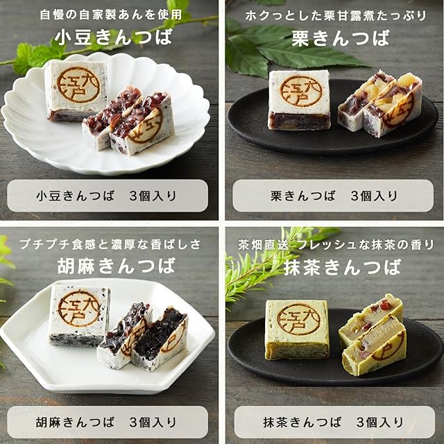【商品詳細】内容量:きんつば(小豆/栗/抹茶/胡麻)4種類 各1個、どら焼 2個、栗どら焼 1個、人形焼(小倉あん 4入)1個、甘納豆(能登産大納言)1個 / 賞味期限:14日 / 保存方法:常温 / 梱包方法 :化粧箱入り