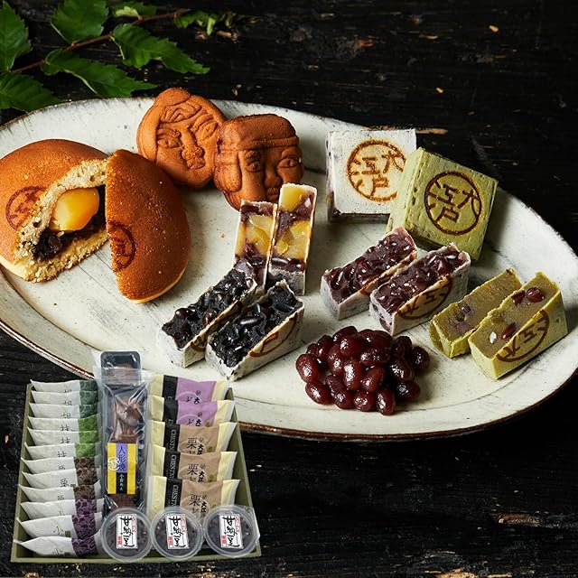 【商品詳細】内容量:きんつば(小豆/栗/抹茶/胡麻)各2個、どら焼 2個、栗どら焼 2個、人形焼(小倉4入)1個、甘納豆(能登産大納言)2個 / 賞味期限:14日 / 保存方法:常温 / 梱包方法 :化粧箱入り