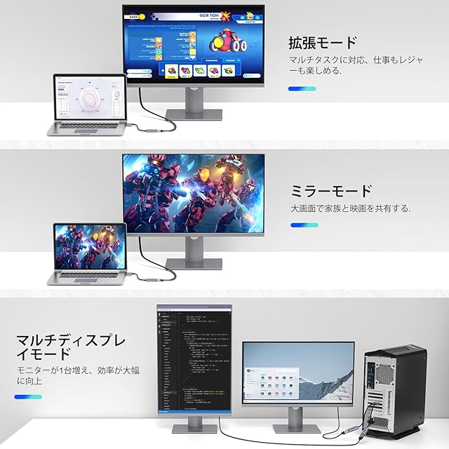 【3つの作業モード]】Displayport HDMI 変換ケーブルはマルチディスプレー環境と対応しているため、多画面で仕事効率を向上させることを目的としてもこれ一本で簡単に実現できます。ミラーモードが同じ画面に表示できるので、大画面での映画鑑賞やゲームもよりクリアに楽しめます。拡張モードは分割画面操作が可能で、仕事と娯楽を両立します。